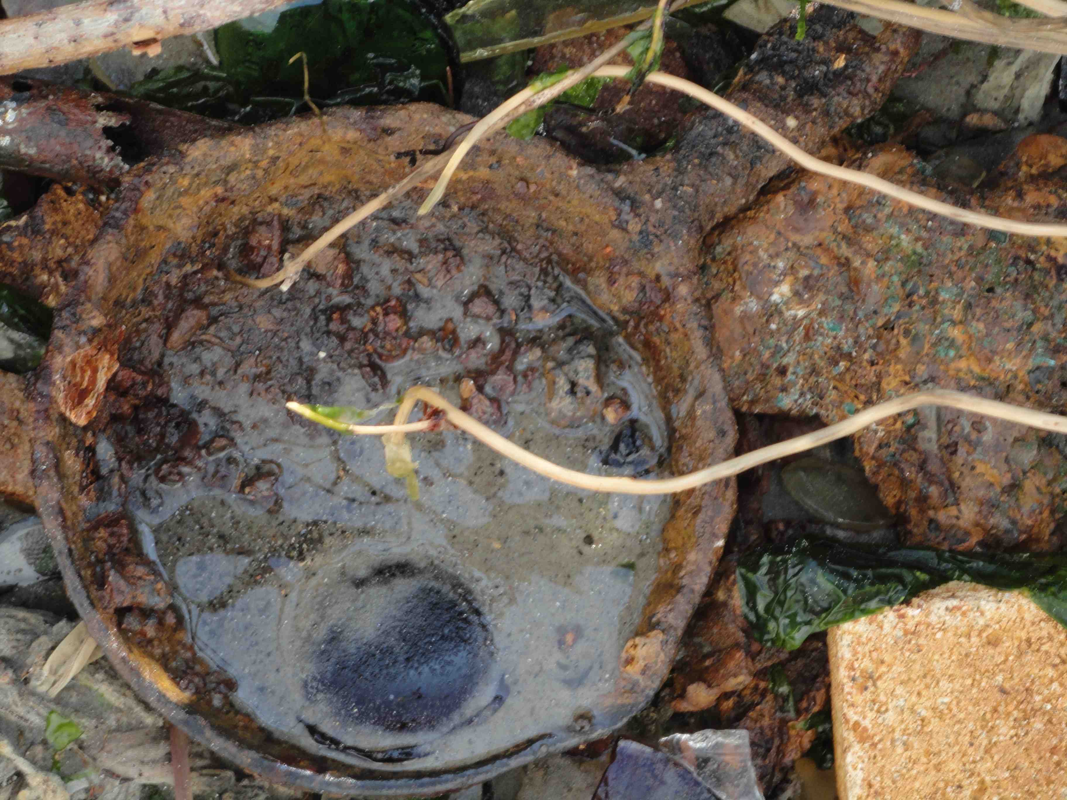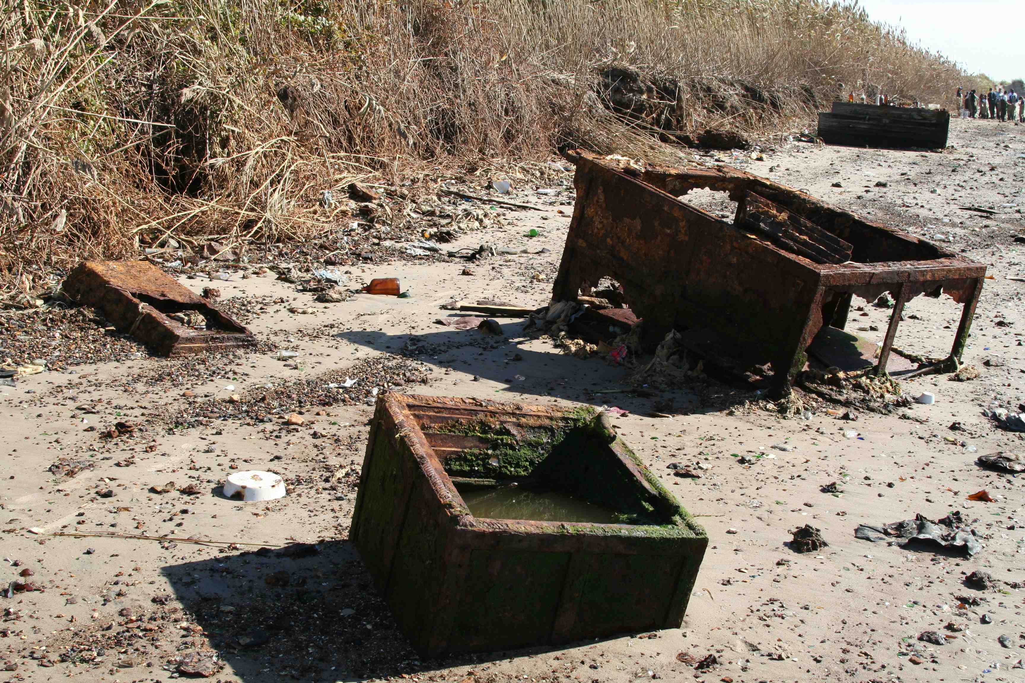 Only a thin and littered strip of beach shows at high tide. At first it seems an unremarkable slice of forgotten sand, nondescript, sloping gently down from the bank of shrubs and grasses and low trees that stands behind it. But countless shards of deep blue glass and rings of bone worn to the color of wood suggest deeper secrets. As the tide recedes, mysteries are revealed in glittering and unlikely excess. The shallow waters are thick with old glass bottles and bottle fragments, pieces of china and porcelain and pottery, remnants of toothbrushes and shaving brushes and hair brushes, vinyl bottles of spray deodorant with names like ‘Odo-ro-no’ and ‘Stopette,’ nail polish still blood-red in its bottles, linoleum flooring and shower curtains, roller skates, dentures, car parts, bricks.