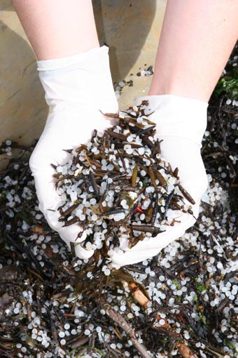 Now where do these plastics come from? Around 80% come from land sources —all steams, air currents, storm water, and shipping routes lead to the sea. There is a mix of post-consumer waste such as water bottles, tampon applicators and toothbrushes, but also nurdles, the raw pellets used in plastic manufacturing. While only ten percent of municipal solid waste is plastic, fifty to eighty percent of wastes on beaches and in the oceans are plastics.