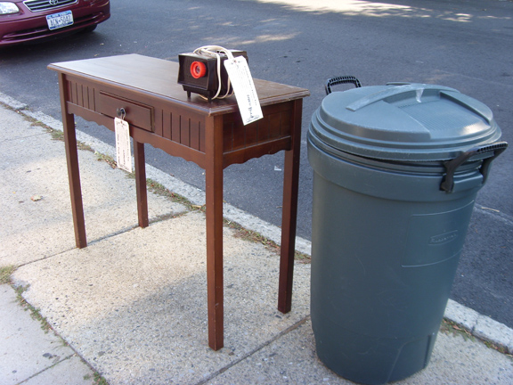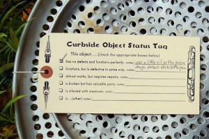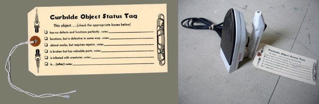 Sarah Nicole Phillips, a curbside collector herself, created the tags because of the “inefficiency” in the trash redistribution system that occurs due to a lack of information. The tags facilitate educated scavenging so objects are diverted to the most appropriate homes. Phillips recalls that, “one [tag] user reported back about a non-functioning mini fridge that was labeled as such. Whoever took the fridge away –it was gone in under an hour– knew what they getting into.” Perhaps the person wanted the fridge for parts, but we can be sure that they didn’t haul it away with the hope of putting yogurt in it right away. Phillips believes that the tag’s presence on a curbside object can also reduce the stigma some people feel while investigating “trash.” A little DIY-bureaucracy goes a long way.