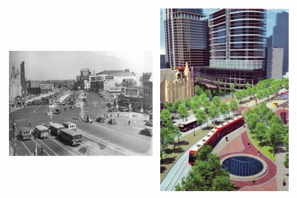The picture above shows the old Journal Square and next to it, a graphic from the vision plan drafted for the space. Anton Nelessen Associates and Dean Marchetto Architects created a New Urbanist redevelopment plan for Journal Square that has the potential to translate the existing space into what they call a more livable, more walkable, greener, New Urbanist place.