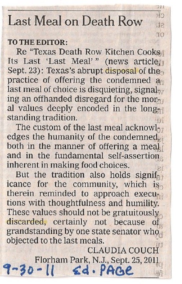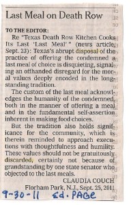 Tucked away in the corner of September 30th’s editorial page in The New York Times rests a short letter to the editor sent in by Claudia Couch of Florham Park, New Jersey. In the letter she refers us to an article about the disappearing practice of offering a condemned man or woman a last meal of choice. Essentially, in Texas, the practice of offering last meal choices to people awaiting execution is ending — the state will no longer be preparing chicken fried steak, fajitas, or pizza (or all of these at once) to those about to receive their lethal injections.
