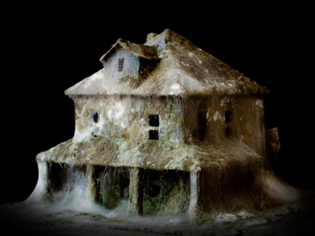 Italian artist Daniele Del Nero‘s series After Effects uses mould to give a slow and plodding life to miniature models he makes out of black paper. He writes, “My purpose is to talk about the sense of time and destiny of the planet after the human species, through the sense of restlessness which abandoned buildings are able to communicate.”