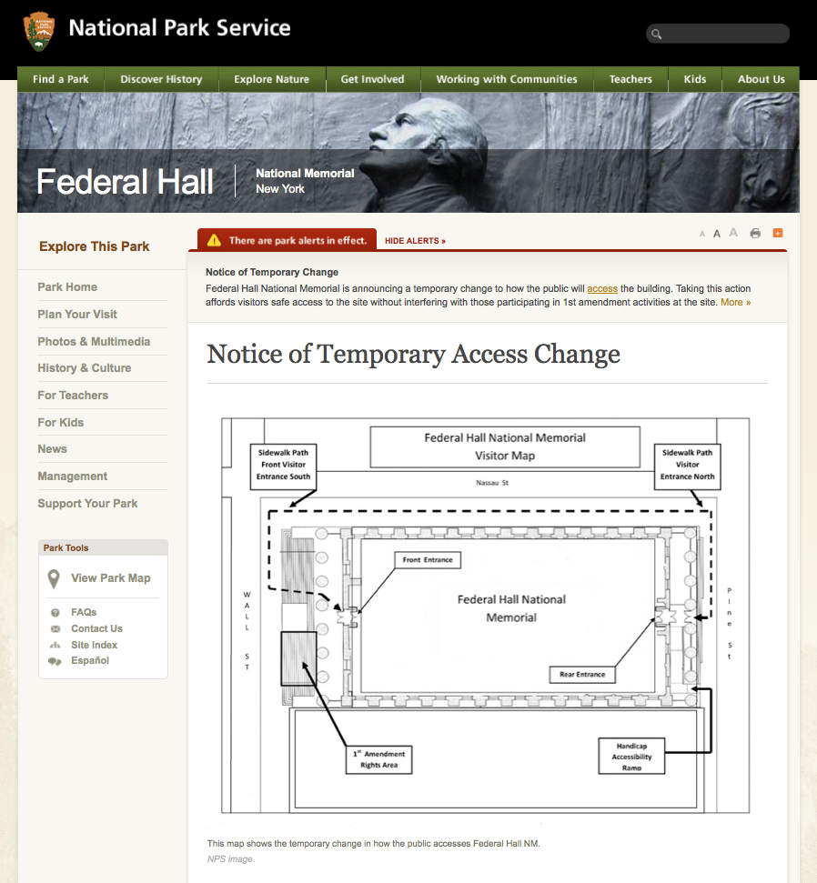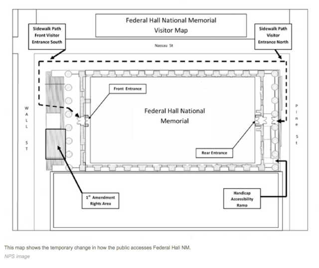 The National Park Service has taken Mary Douglas’ axiom that dirt is “matter out of place” and extended it to an auditory and kinetic register. According to their map, free speech, the press, assembly, and the petition of the Government is out of place in all areas of the Federal Hall National Memorial except for the right hand side of the front steps.