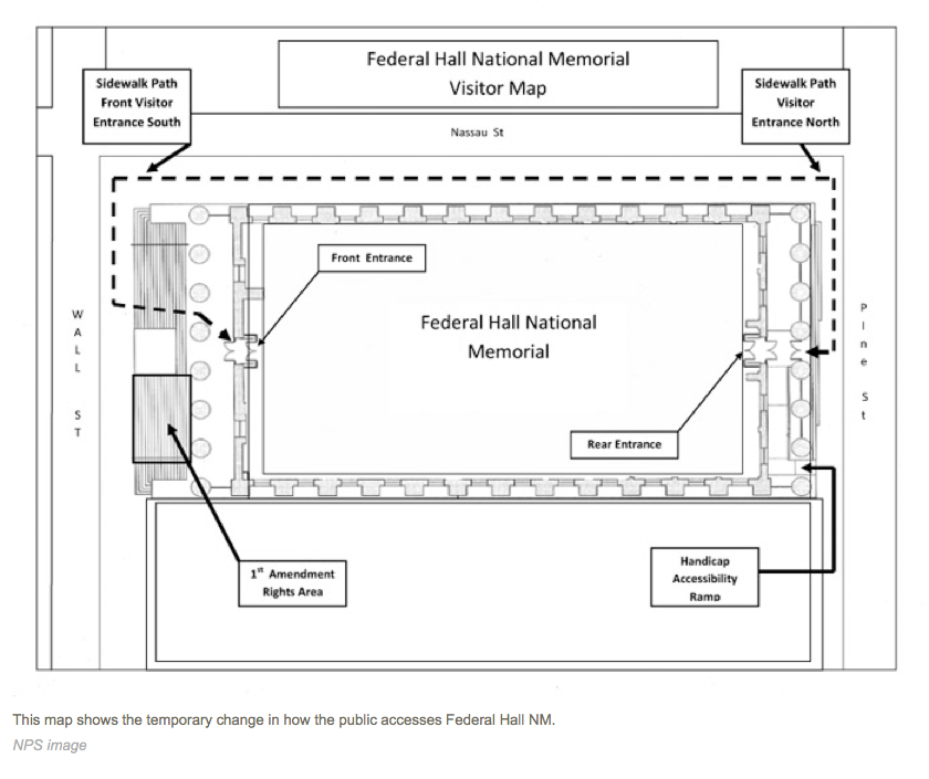 Screenshot from the National Parks Service website for the National Hall Federal Memorial in New York City. The original caption reads “This map shows the temporary change in how the public accesses Federal Hall NM.” Map by the National Park Service.