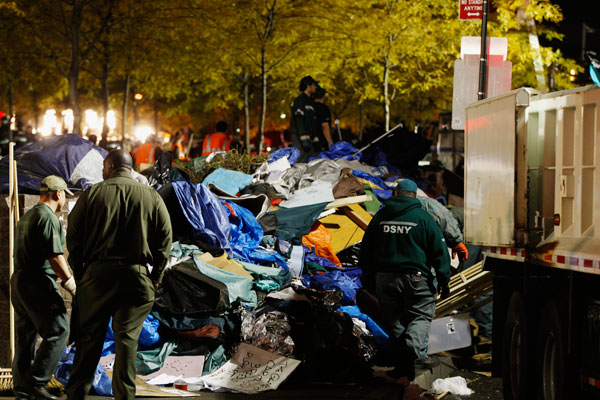 Photograph of the eviction on November 15th 2011, with New York City Sanitation workers loading protester’s belongings into trucks. Photo: Reuters/Lucas Jackson.