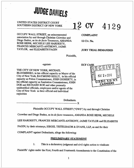 Occupy Wall Street, and specifically representatives of the People’s Library, are suing New York City’s Mayor Bloomberg, its police commissioner Ray Kelly, the Sanitation Commissioner John Doherty, and other City officials in the seizure and discard of 2,798 books during the raid on Zuccotti Park on November 15, 2011.