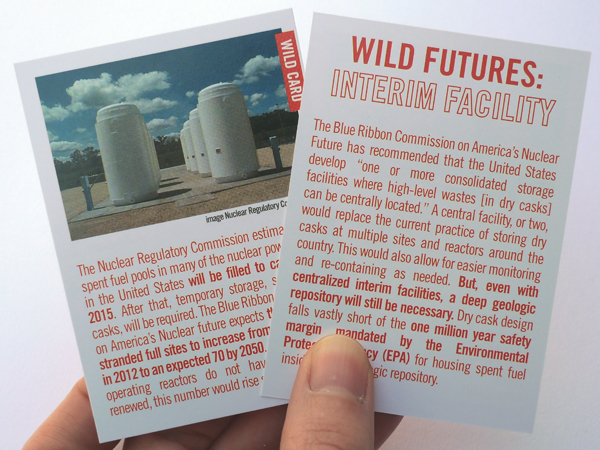 These cards are an artful, humorous way to communicate the enduring dilemma of nuclear waste and the material and infrastructural stop gaps used to not-quite-contain it for the lifespan of our species. That’s an awful lot to put in a card set. Issues of communication have long surrounded nuclear waste. The titillating-terrifying “Expert Judgment on Markers To Deter Inadvertent Human Intrusion Into the Waste Isolation Pilot Plant,” commissioned by the Department of Energy in 1991 is a conceptual plan for a ten thousand year marker system for the WIPP nuclear storage facility. The plan involved thirteen linguists, scientists, science fiction writers and anthropologists trying to create a “Keep out” sign that would transcend changes in language, culture, and even species. The results are elegantly complex and, some would argue, futile. The temporarily and danger of nuclear waste exceeds our ability to describe it.