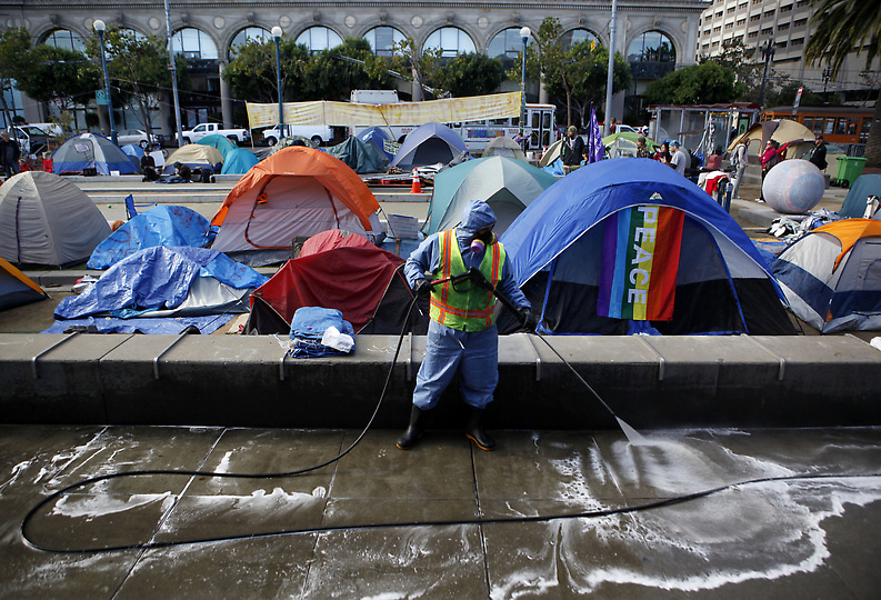 City worker cleaning area around Occupy San Fransisco encampment, November 17th, 2011. Photo by Beck Diefenbach/AP. http://beckdiefenbach.com/editorial/?page_id=223