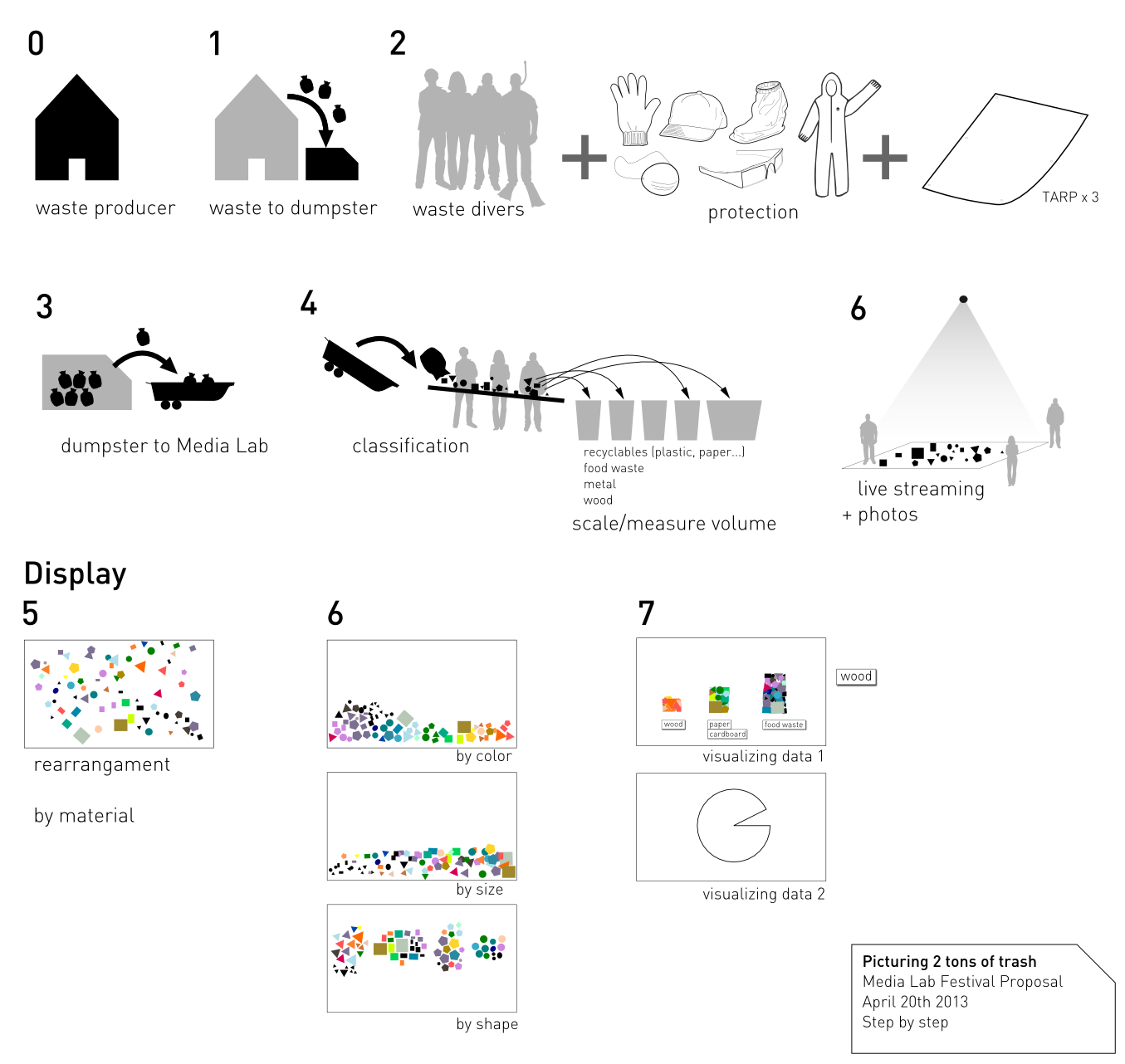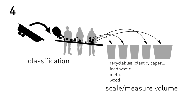 Personally and professionally, I am often concerned that tashy messages will reiterate popular mythologies about waste: that we, as individuals, make too much waste, when we, as individuals, have very little agency in the matter and are rather part of an infrastructure of waste. I would like to see a display of industrial vs. “personal” waste, where all the waste is in the former category and nothing is in the latter. The same could be done with systemic vs. unique waste, or waste generated in the pursuit of capital vs. that which is not (perhaps some community agricultural waste would end up in the latter pile). In short, I’m saying that Basurama’s step number 4, classification, is where the qualitative work of quantitative work comes in. Classification determines what will be proven in the theater of proof.