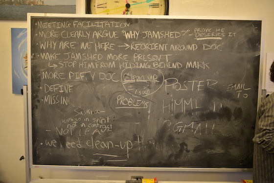 A photo of the blackboard in the office shows the student’s activist plans, and cleaning is mentioned more than once: