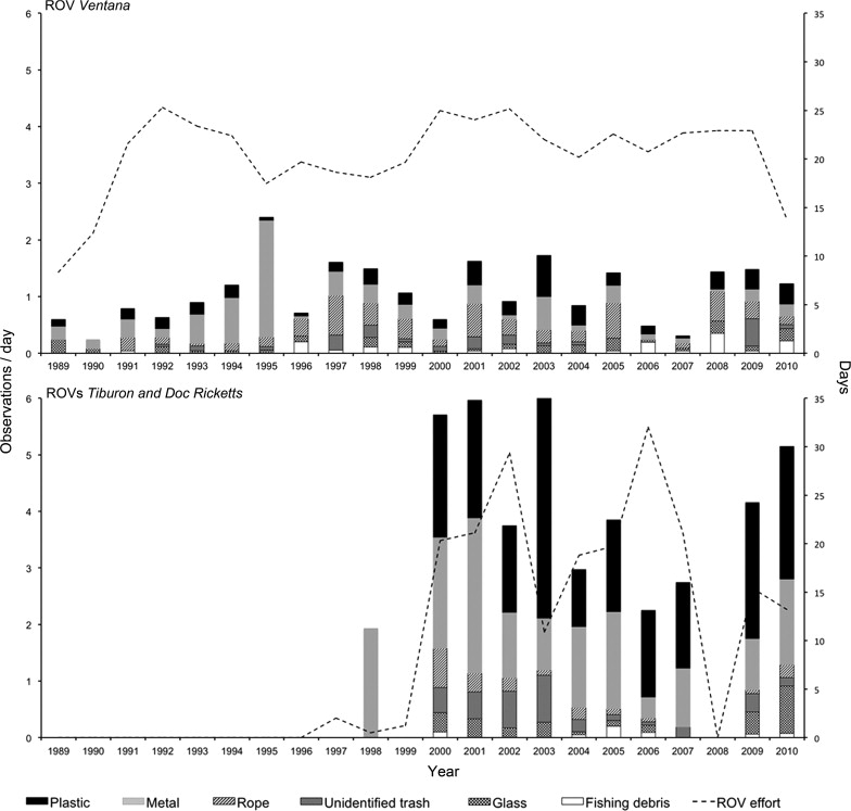 From the report: Relative frequency of marine debris observations of the six most common categories shown by year for MBARI’s three ROVs.
