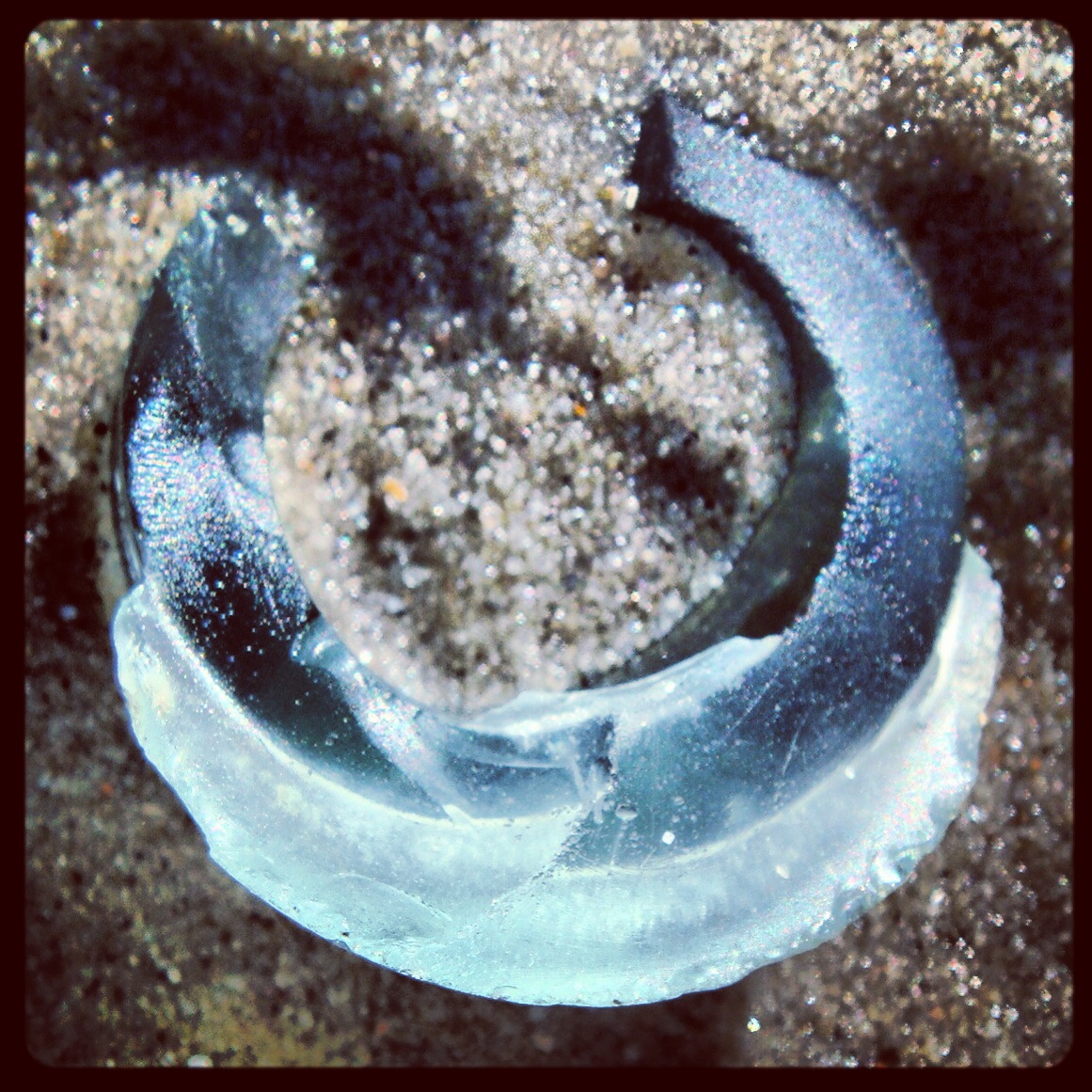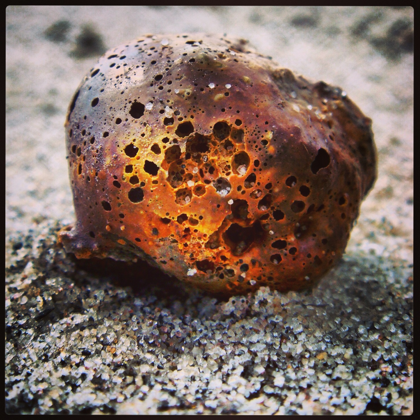 Many of the objects at Deadhorse Bay occur in these conglomerate forms, where heat and pressure in the original landfill partly melted and fused glass together with other objects, or, in this case, metal later exposed to salt water corroded objects together. Now, just a hint of the original watch remains. Photograph by Max Liboiron. Creative Commons License (see bottom of page).