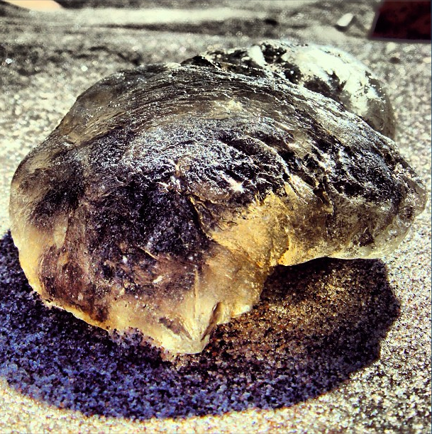 A glass conglomerate. It is common in dumps, where heat from pressure, and even open fires (as was common on Barren Island), can make glass viscous. These glass lumps engulf nearby garbage to create crystalline waste pods of surprising beauty and longevity. Photograph by Max Liboiron. Creative Commons License (see bottom of page).