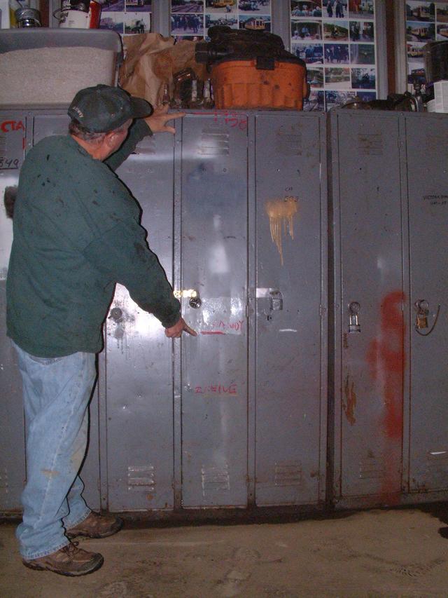 Original caption: “Wayne shows the water level in the shop relative to the volunteers’ lockers. IRENE at the bottom was 20 inches. SANDY was 30 inches above the floor, and Wayne’s left hand points to what was narrowly avoided — the 1938 flood level. J.Hakner” From http://www.bera.org/sandy.html