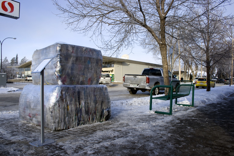 I had originally envisioned these bales encased in a clear resin, in a manner akin to the work of Rachel Whiteread, so that they would become a permanent and seductive monument. As I continued to consider both the logistics and the significance of dealing with the material this way, I soon conceived of the work differently, as I felt, more effectively. As an unmanipulated object the work related to a number of art historical precedents, and had the added benefit of being temporary and open to repurpose. The historical work to which I primarily refer is that of César Baldaccini, a new realist sculptor whose series of ‘compressions’ were comprised of scrap metal, crushed into cubes with colouristic relationships. The notion of having a compression ‘ready-made’ by the city of Saskatoon seemed both site-specific and evocative, and in a way, also collaborative. When I saw the opportunity to apply for the Placemaker program, I honed these ideas and submitted to produce the work.