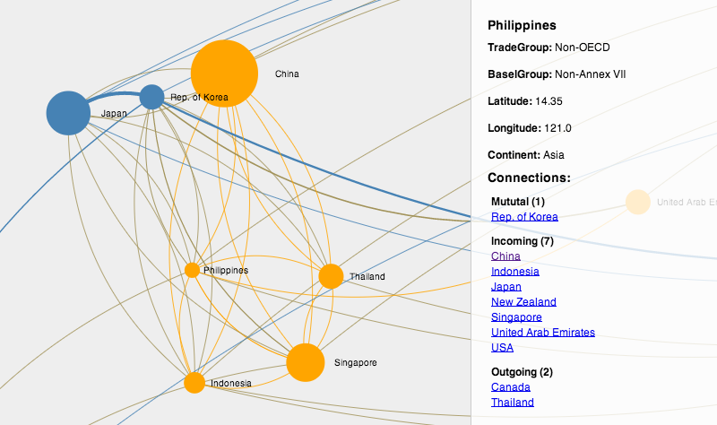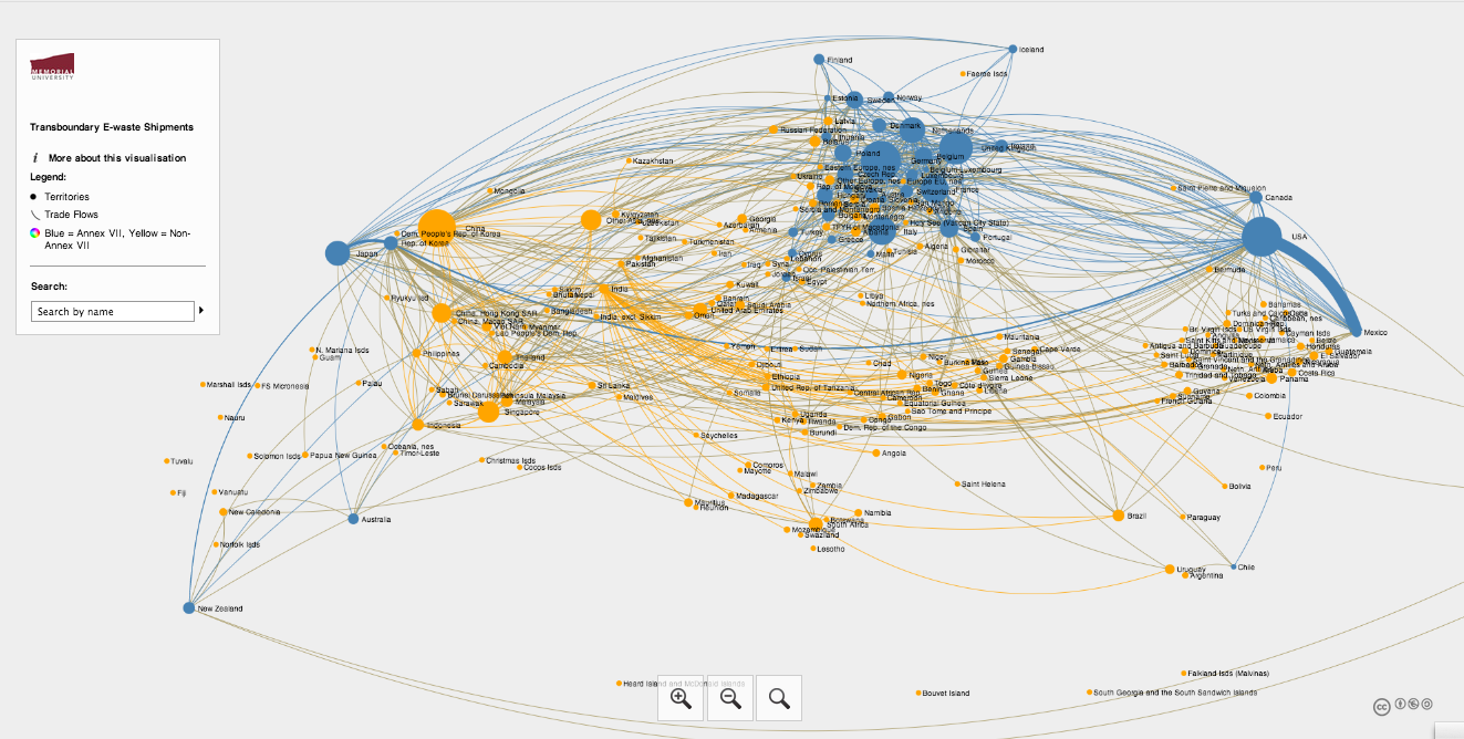 The data are organized into territories and the flows of e-waste that connect them. Territories are colour coded to reflect their status under Annex VII of the Basel Convention (blue for Annex VII territories [developed nations] and yellow for non-Annex VII territories [developing nations]). The larger the circle representing a given territory (e.g., Canada) the more other territories report receiving e-waste shipments from it.