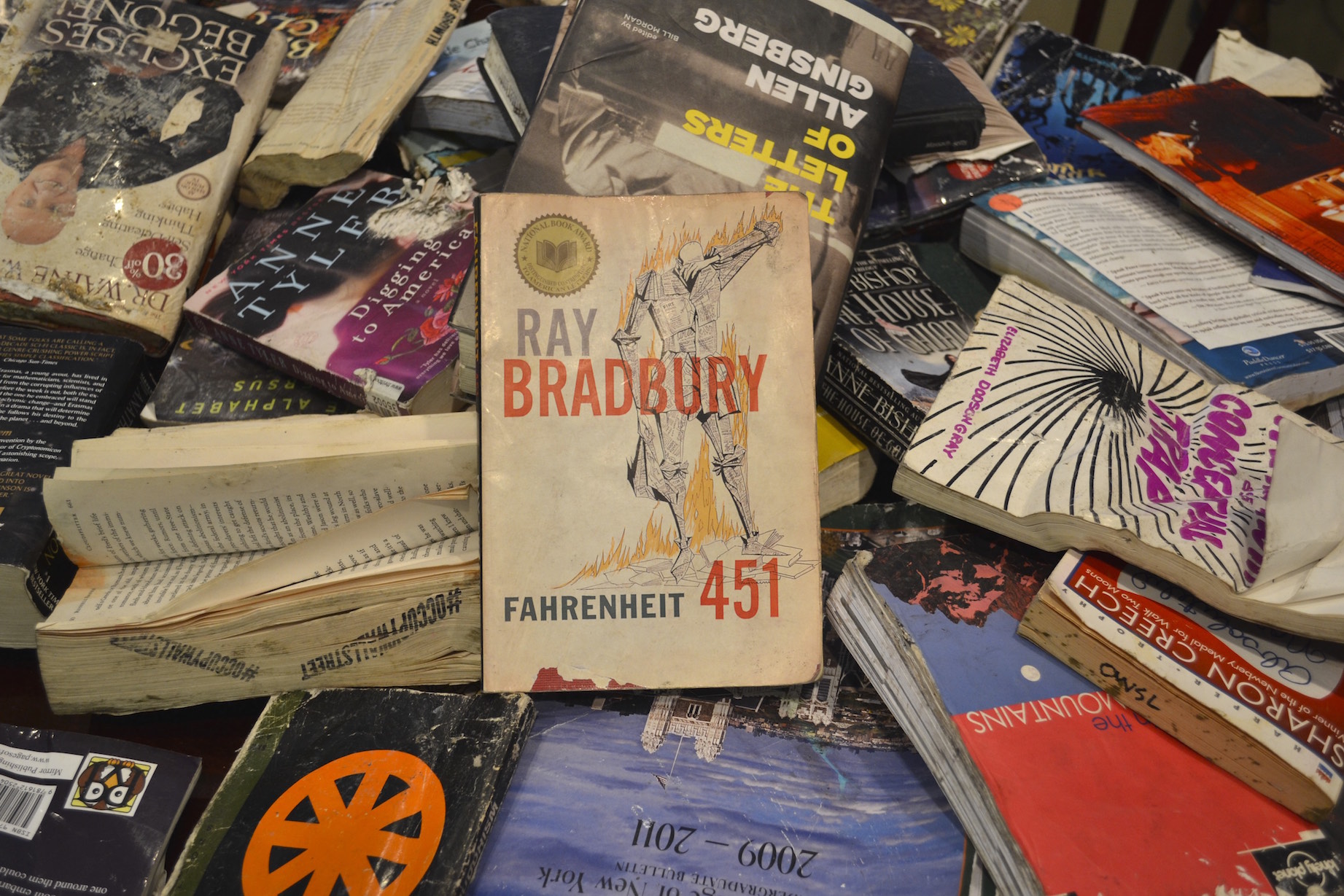 We covered the table in front of us with these books, arranging them as evidence – evidence of the horrible irony that Mayor Bloomberg’s orders had resulted in seizing and damaging a copy of Ray Bradbury’s Fahrenheit 451 (1953).