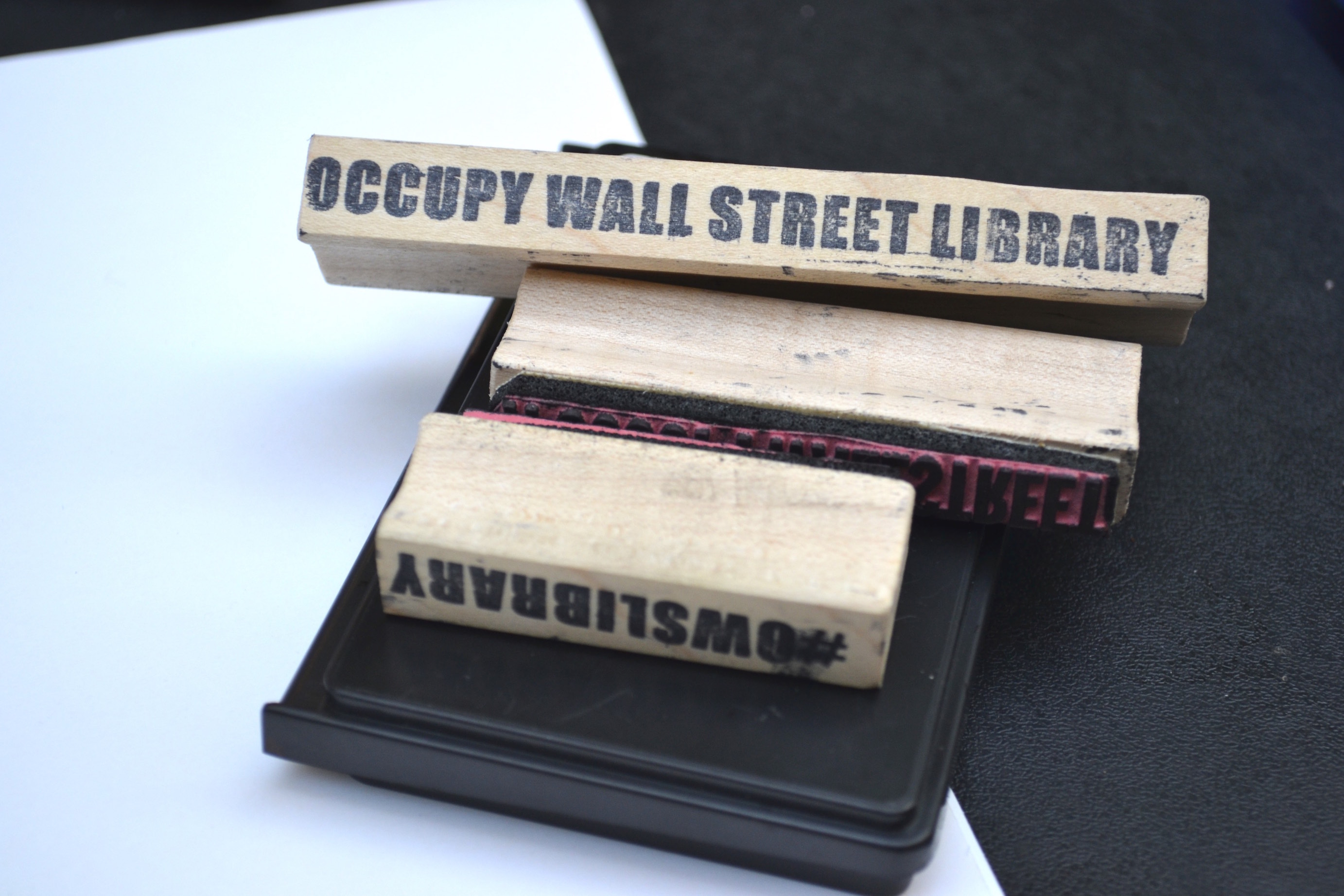 The books were received, as gifts, through an intake process. We wrote OWSL (for Occupy Wall Street Library) on the edges of the books, and later stamped them with a beautiful OWSLibrary stamp someone made for use (another gift). We recorded the ISBN number, we entered those numbers or details of the book, pamphlet, newsletter, or other media into the digital catalogue, and then library working group members and volunteers sorted them into categories, into boxes, into piles, into people’s hands.