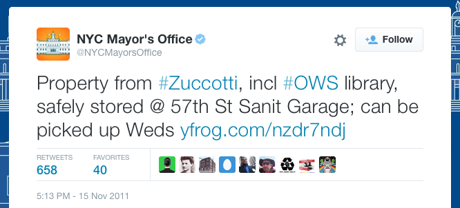 The night of the destruction, I tweeted “Right now, the NYPD are throwing over 5,000 books from our library into a dumpster. Will they burn them?” After this report was picked up by media and reported widely, the Mayor’s office responded by posing books in orderly piles on a table at the DSNY garage, photographing them, and tweeting “Property from #Zuccotti, incl #OWS library, safely stored @ 57th St Sanit Garage; can be picked up Weds.” This was the first moment our books became evidence in a public relations and legal battle between Occupy, the library, and the City of New York.