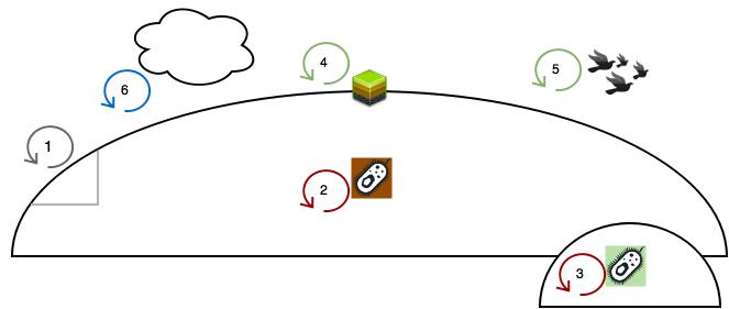 The mound shape of a typical sanitary landfill is a familiar one. The cross-section depicted on the left side is what is known in North America as the open-face: the section temporarily exposed so that more waste can be added. The number signifies that this is only one kind of temporality, though one that is strongly associated with landfilling as a method of waste disposal. This temporal cycle (depicted by the familiar circular arrow) involves the disposal of waste that is continually collected, transported and repeatedly added to the landfill, over and over again, making landfills grow in size over time and eventually close when there is no more room. To the extent that human waste producers and workers are considered the sole agents involved in the creation of landfills, this image is complete. But there is much that this depiction of landfilling leaves out.