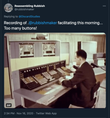 On November 16 & 17, 2020, Discard Studies held our first ever Twitter Conference. Held over two days, 20 presenters delivered threads of 10-12 Tweets on topics ranging from the role of the plastic sachet economy on environmental justice to the way automation and artificial intelligence in waste management during the COVID-19 pandemic has heightened issues of invisibilizing and externalizing labour. The conference cohered through the use of the #Discard2020 hashtag and retweeting from the @DiscardStudies Twitter account. The goal of the Twitter Conference was to maintain the spirit of learning about new work, meeting new scholars, and showcasing diverse scholarship in the field characteristic of face-to-face conferences with the accessibility and documentation of an online conference. The conference was organized by the three Discard Studies editors (Max Liboiron, Josh Lepawsky, and Alex Zahara), drawing on previous Twitter Conferences by Public Archaeology, The World Seabird Union, and the American Society for Environmental History (ASEH).