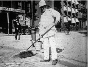 One of George Waring’s White Wings cleans NYC streets, 1880s.