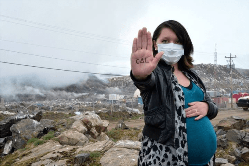 This image of a pregnant Inuk woman was taken during a four month long dump fire that occurred in the Arctic community of Iqaluit, Nunavut. During the fire, pregnant women and women of childbearing age were warned not to go outside due to risks of dioxin contamination. The Inuktitut syllabics written on her hand read ‘Taima’ or ‘enough’, referring to decades of government underfunding that contributed to this and many other dump fires. The image is an example of refusal, as the image refuses to depict Inuit as passive victims of slow violence, instead redirecting attention towards government institutions. The image was distributed to media outlets and became the Facebook profile photo of a local ‘Stop the Dump Fires’ protest group. Photo by Shawn Inuksuk, 2014.
