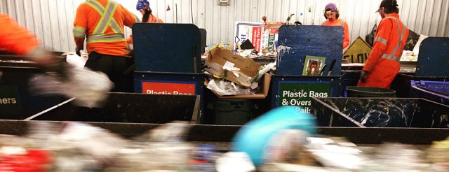 Workers at a waste recovery facility sort out recyclable from non-recyclable items. A sign warns workers to remove plastic bags in particular. Photo by Max Liboiron.