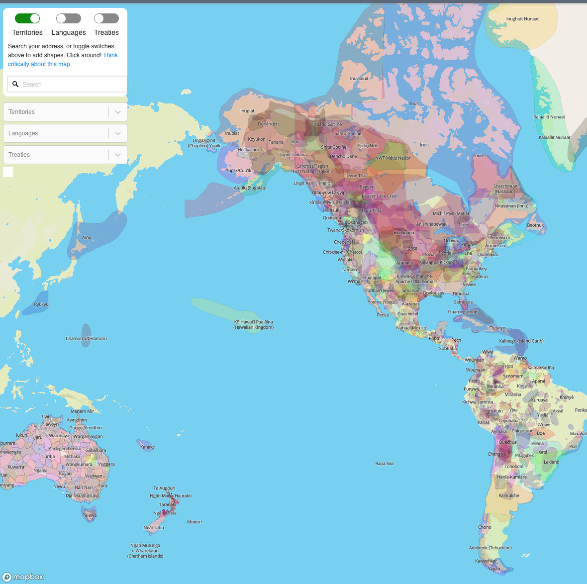 Interactive and searchable map of Indigenous territories, languages, and treaties produced by Native Land Digital.