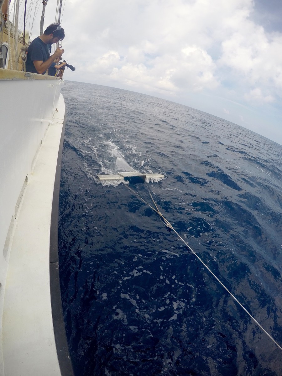 DCIM100GOPROGOPR0209. Published 06/26/2015 at 3000 × 4000 The manta trawl in action. It skims the surface of the water collecting all floating items in its mesh. Photo by Max Liboiron.