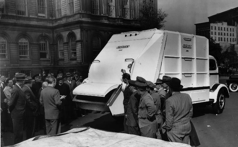 A Sicard Sanivan being demonstrated for the Department of Sanitation, New York City (DSNY) in 1949. Even though the department had been using mechanized trucks for at least a decade prior to the date this was taken, packer trucks were still a relatively new commodity in the United States, as this show in front of City Hall indicates. Image from http://www.classicrefusetrucks.com/